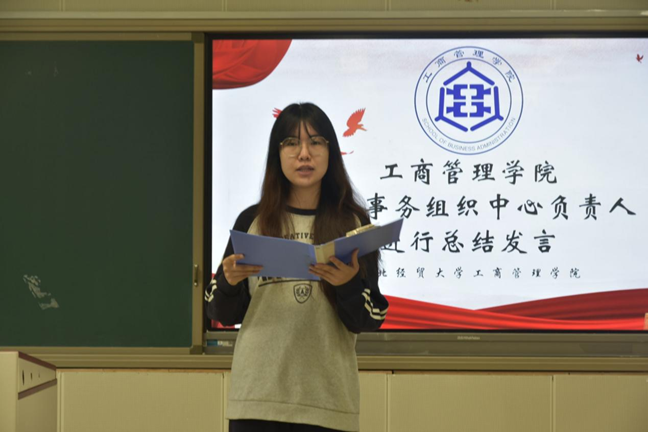 随后,少数民族学生代表李嘉懿结合自身经历分享了对于民族团结的深切感悟。作为满族学生,她以民族文化符号为切入点,讲述了各民族文化交融共生的和谐之美。她提到,在学院学习生活中,汉族室友帮忙查找民族特色品牌案例、节日里互享民族美食等日常点滴,让她深刻体会到“各民族一家亲”的温暖。她倡议青年学子做民族文化的讲解员,主动挖掘、分享各民族优秀文化,打破认知壁垒;争做团结实践的行动者,从课堂互助、生活帮扶等小事做起,把团结情谊落到实处;勇做担当使命的奋斗者,将民族团结信念融入专业学习与未来发展,用青春力量助力各民族共同进步。