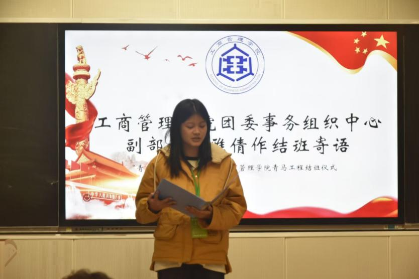 随后,团委事务组织中心副部长郑博旭为青马学员代表颁发结业证书,并对本次活动作总结性讲话,他肯定了本期青马工程的丰硕成果与学员们的显著进步,勉励大家以结业为新起点,坚守青马信仰,锤炼过硬本领,为社会发展注入活力,在实现中华民族伟大复兴中国梦的征程中书写属于工商学子的壮丽篇章。