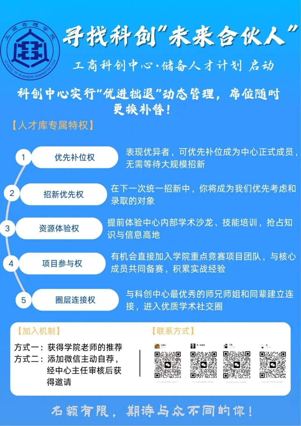 回顾本学期,工商科创中心不仅在成绩上实现突破,更在人才培养、氛围营造、平台拓展等方面积淀了深厚的软实力。我们始终相信:创新源于行动,成长始于陪伴,星光来自每一个人的坚持与闪耀。如果你也渴望成为其中的一员,欢迎扫描下方二维码,与我们一同开启下一段成长旅程!