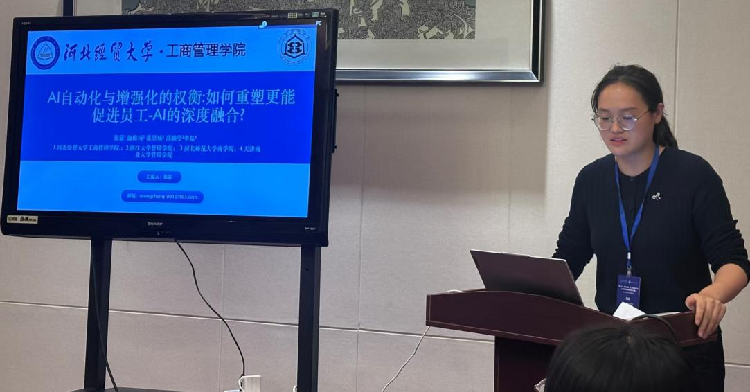 在10月18日下午举行的“人机协作与员工行为”分论坛中,我院张蒙博士受邀作题为“AI自动化与增强化的权衡:如何重塑更能促进员工-AI的深度融合?”的学术汇报。报告基于社会信息加工理论和技术接受模型,探讨了AI自动化与增强化应用一致性对员工-AI深度融合的影响机制。该研究为企业在人工智能时代优化AI战略、推动人机协同共融提供了重要理论参考与实践启示。汇报现场气氛热烈,获得与会专家的高度关注与积极评价。