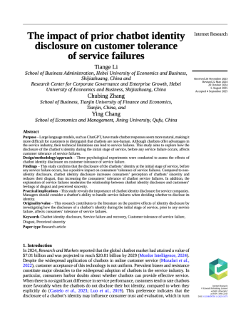 近日,工商管理学院李天歌博士作为第一兼通讯作者撰写的论文"The impact of prior chatbot identity disclosure on customer tolerance of service failures"在信息系统与电子商务领域国际权威期刊Internet Research正式刊出。