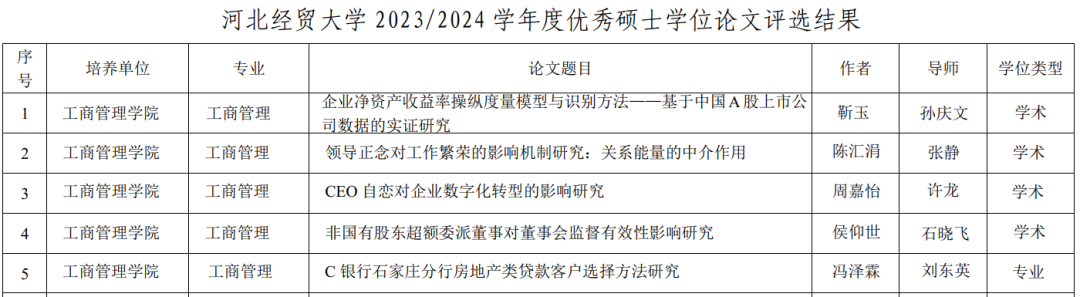 我院2024届毕业生靳玉(导师:孙庆文)的学位论文《企业净资产收益率操纵度量模型与识别方法—基于中国A股上市公司数据的实证研究》;周嘉怡(导师:许龙)的学位论文《CEO自恋对企业数字化转型的影响研究》;陈汇娟(导师:张静)的学位论文《领导正念对工作繁荣的影响机制研究:关系能量的中介作用》;侯仰世(导师:石晓飞)的学位论文《非国有股东超额委派董事对董事会监督有效性影响研究》;冯泽霖(导师:刘东英)的学位论文《C银行石家庄分行房地产类贷款客户选择方法研究》分别荣获2023/2024学年度校级优秀硕士学位论文并全部推荐参加省级优秀硕士学位论文评选。