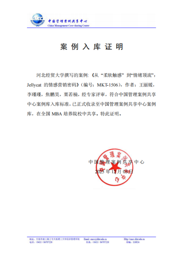 近日,工商管理学院王丽媛副教授、2024级工商管理学院研究生李瑾瑾、栗若楠和2024级人力资源管理2班焦鹏昊撰写的教学案例《从“柔软触感”到“情绪顶流”:Jellycat的情感营销密码》(编号:MKT-1506)入选中国管理案例共享中心案例库。