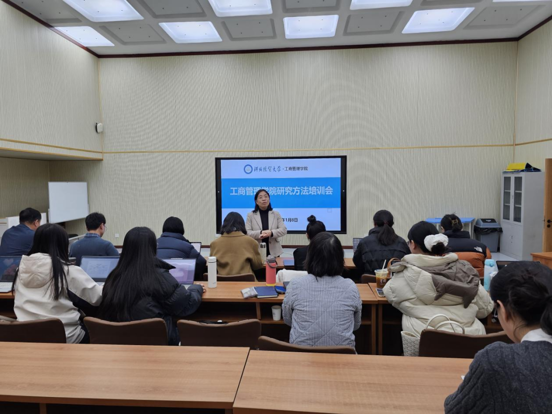 1月8日,工商管理学院于MBA一教室举办研究方法专题培训会。由工商管理学院教师张雨、张蒙、李天歌分别作研究方法类报告,会议由工商管理学院院长李桂荣教授主持,副院长石晓飞、学院青年博士教师参加会议。